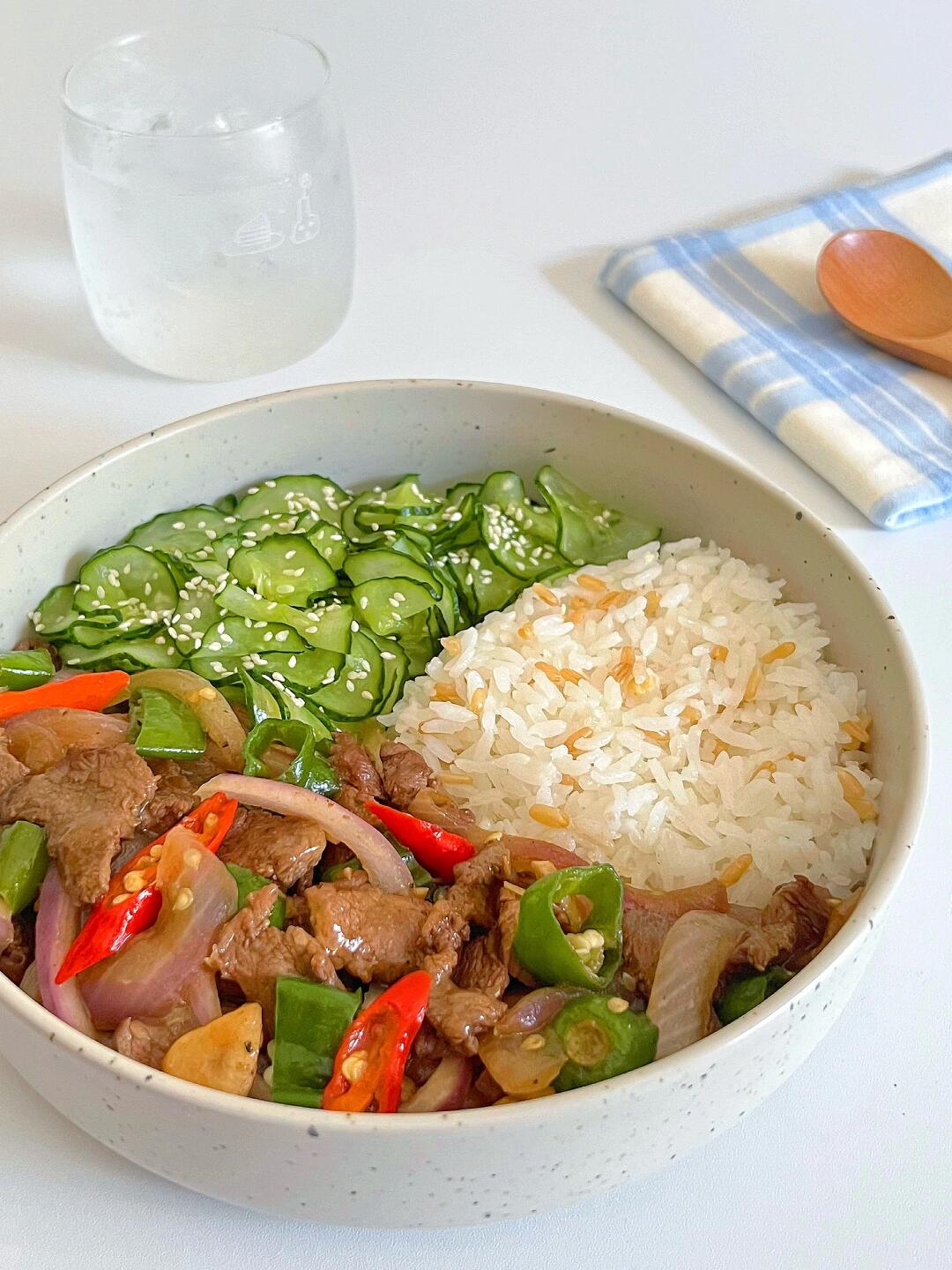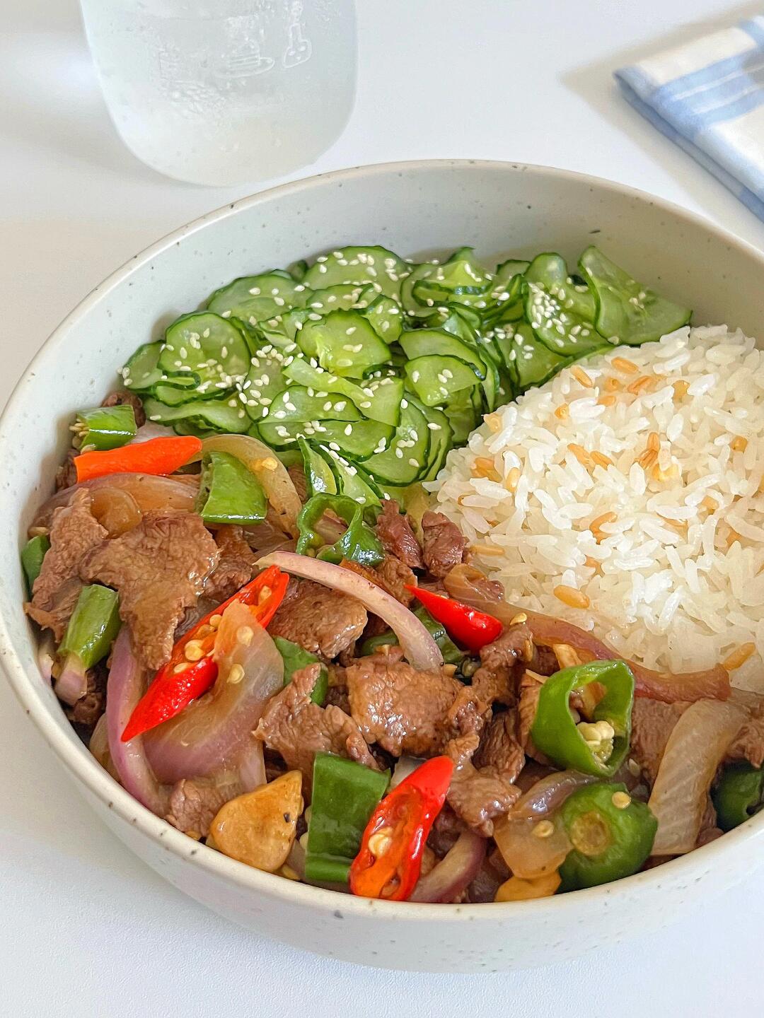 今天吃的是鲜椒洋葱炒牛肉,大火猛炒加辣,鲜香又下饭,超爽!另外搭配了一些简单快手的盐渍黄瓜,口感treetree的很清爽,适合夏天!
