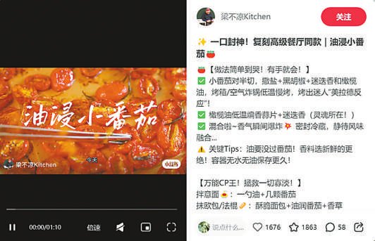9月23日,《中国消费者报》记者登录社交平台搜索关键词“油浸小番茄”,发现至少有百余条相关分享笔记。博主@梁不凉Kitchen用一条视频演示了油浸小番茄的料理全过程:将小番茄洗净去蒂后对半切,撒盐、黑胡椒、迷迭香和橄榄油,放入烤箱或空气炸锅中低温(135度)慢烤大约70分钟。然后,在锅中放入橄榄油,低温煸香蒜片和迷迭香制作香草油,再将烤好的小番茄放入消毒的玻璃瓶,趁热浇入香草油确保小番茄被浸透,即可放入冰箱冷藏三周时间。