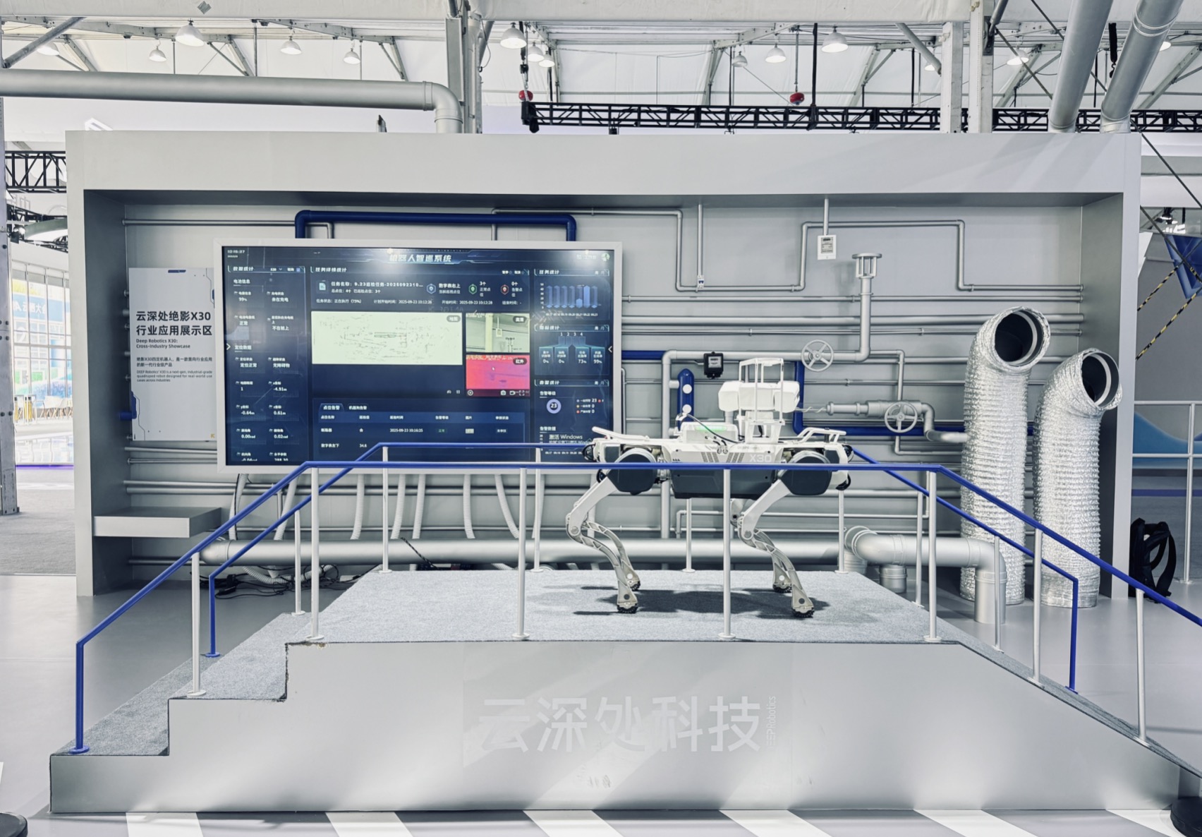 在云栖大会云深处科技展馆内,工作人员1:1还原了变电站真实作业场景。绝影X30四足机器人现场完整演示了全流程自主巡检作业——从自主导航进入巡检区域,到精准完成数据采集,再到自动生成巡检报告,最后自主返回充电桩补能,全程无人工干预,呈现了工业级智能巡检的完整闭环。
