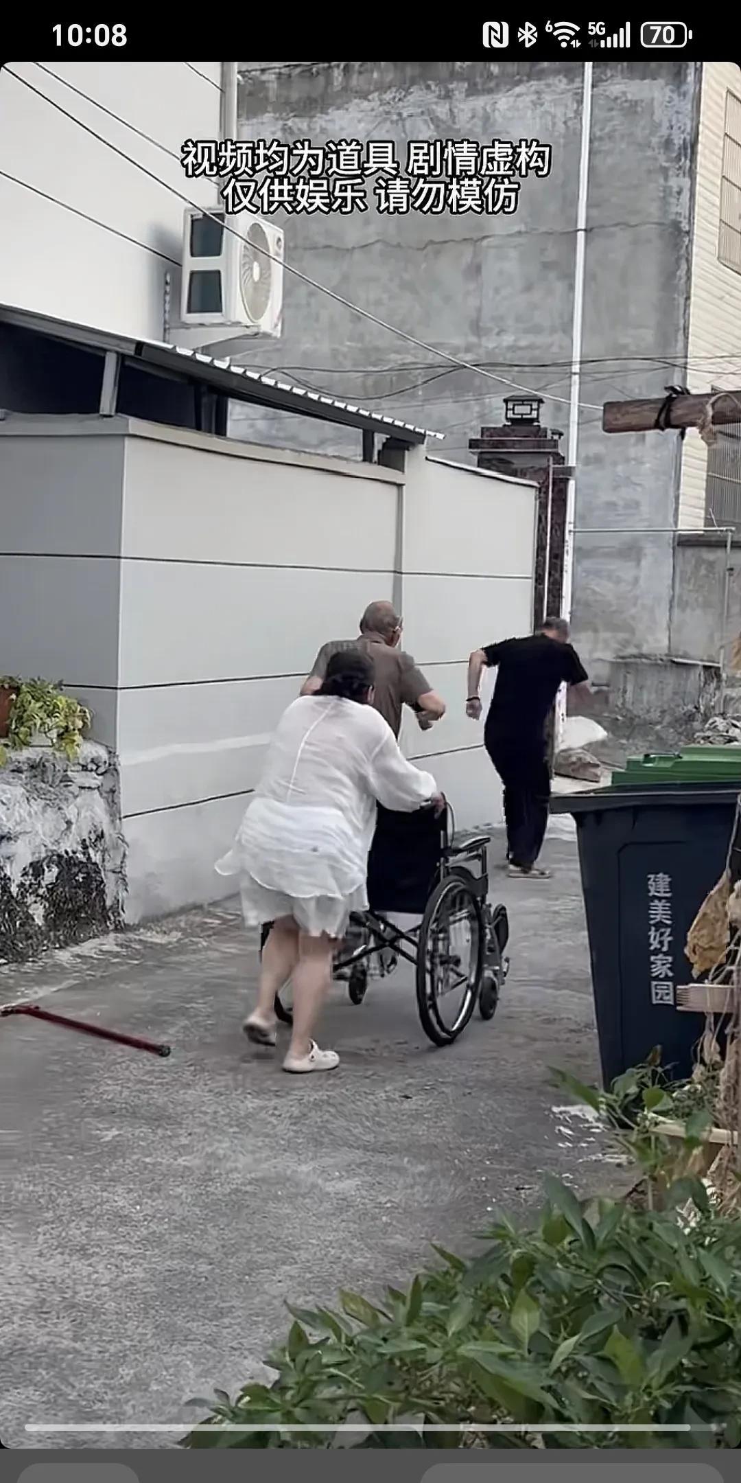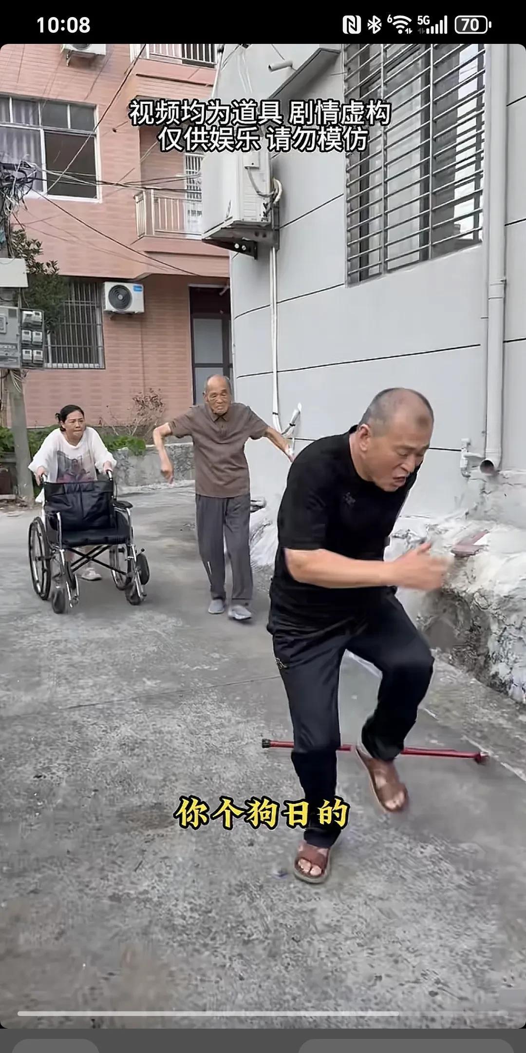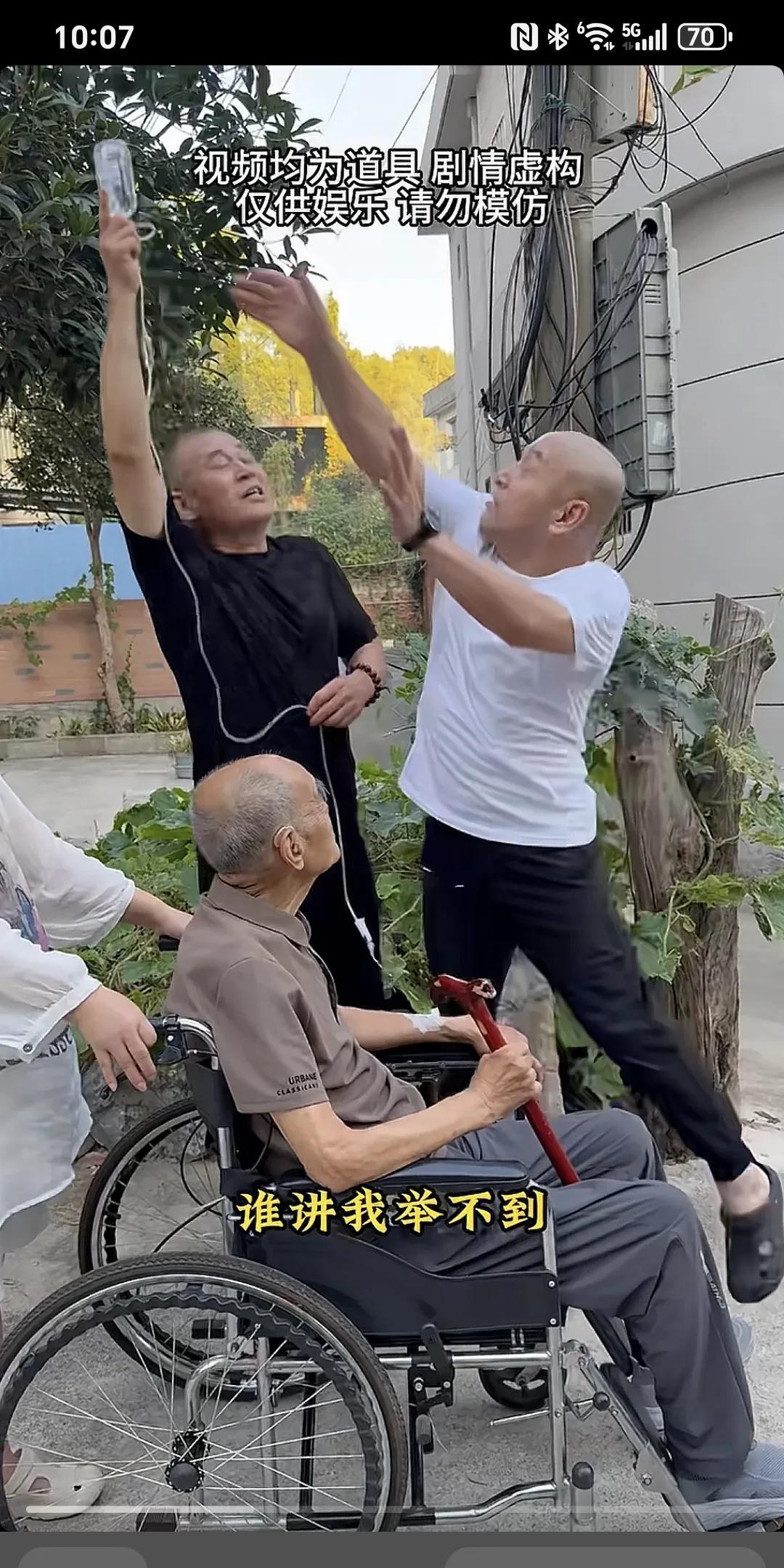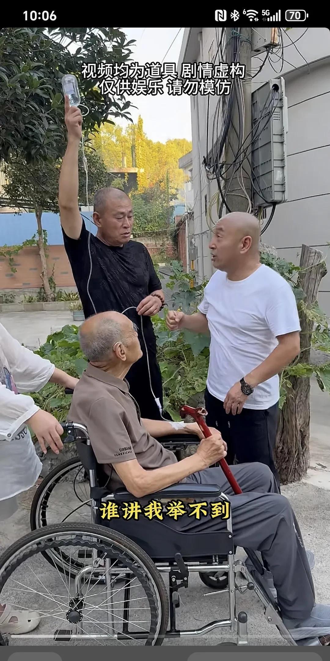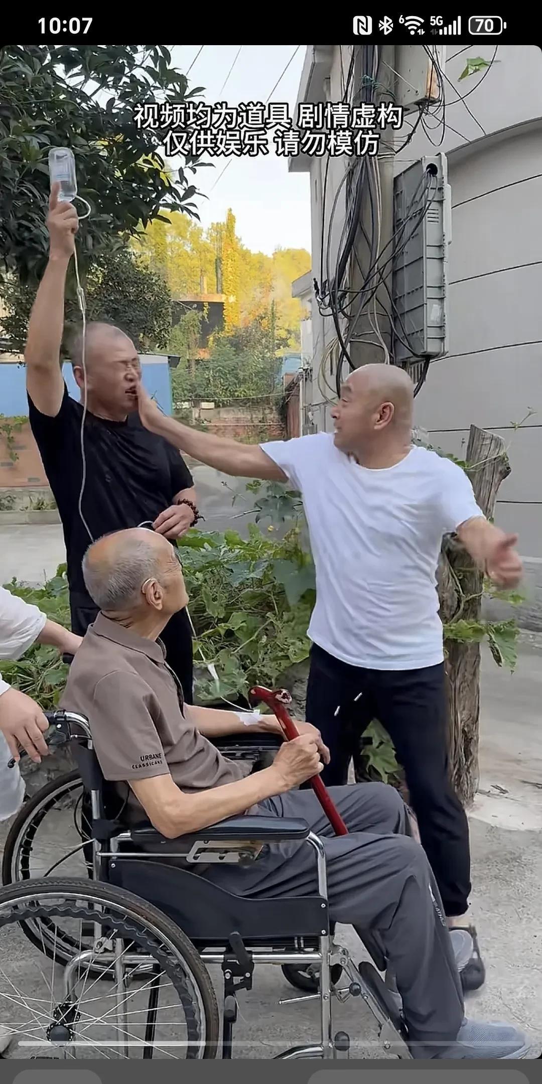 儿媳妇推着坐在轮椅上的爸爸去散步,同时爸爸还在输液。哥哥举着吊瓶,这时弟弟跑过来,说:“大哥,让我来举着吧。”大哥回应:“你个子矮,够不着。”爸爸也说:“你让你大哥举着。”弟弟不服气:“谁说我举不到?电线杆有什么用?”说着便跳起来去够,没够着,抬手给了哥哥一耳光后撒腿就跑。哥哥又气又恼,拿起输液瓶子砸过去,骂道:“你个武大郎。”接着追弟弟,没追上。等他转回来,才反应过来,一把将爸爸输的吊瓶扔了出去。爸爸从轮椅上站起来,骂骂咧咧:“你个狗日的,别跑!”说着追着大儿子,还把拐杖扔出去打儿子。 哈哈哈,那个老爷子手跑针没?看把老爷子气的都能从轮椅上跑着扔拐杖追你了。 个子小啥都想做,不然还打人,最后结局笑死人了,你们都是好演员。