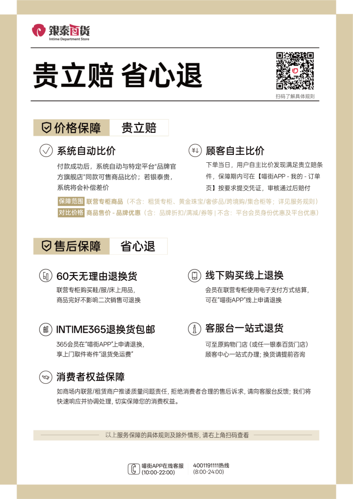 今年6月,银泰百货的“放心买”承诺升级了,推出全新的“贵立赔”服务。不管是在银泰百货线下门店还是喵街APP线上购买的商品(除租赁专柜、黄金珠宝、奢侈品、集合柜等特殊商品外),都可享受该服务。值得一提的是,如果系统比价发现买贵了,系统将会自动补偿差价,同时消费者也可以在喵街APP的订单里自助申请比价。