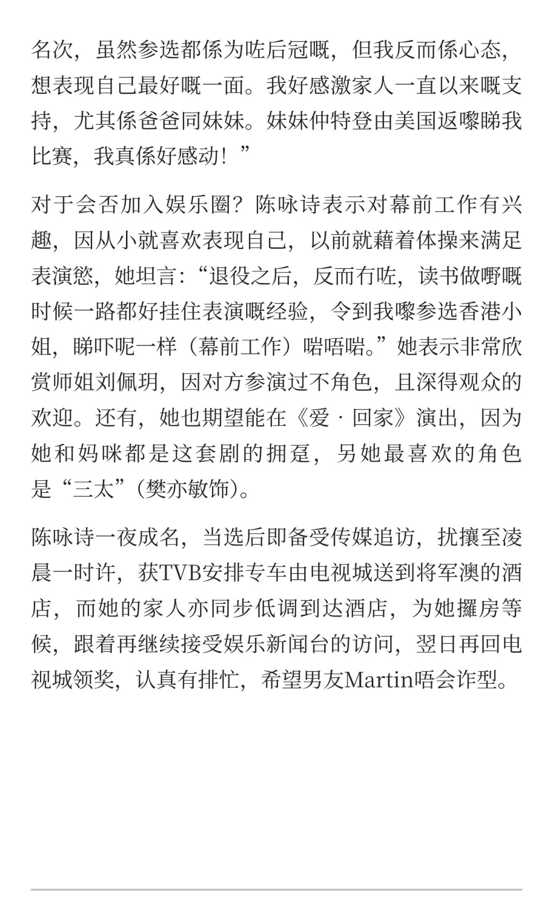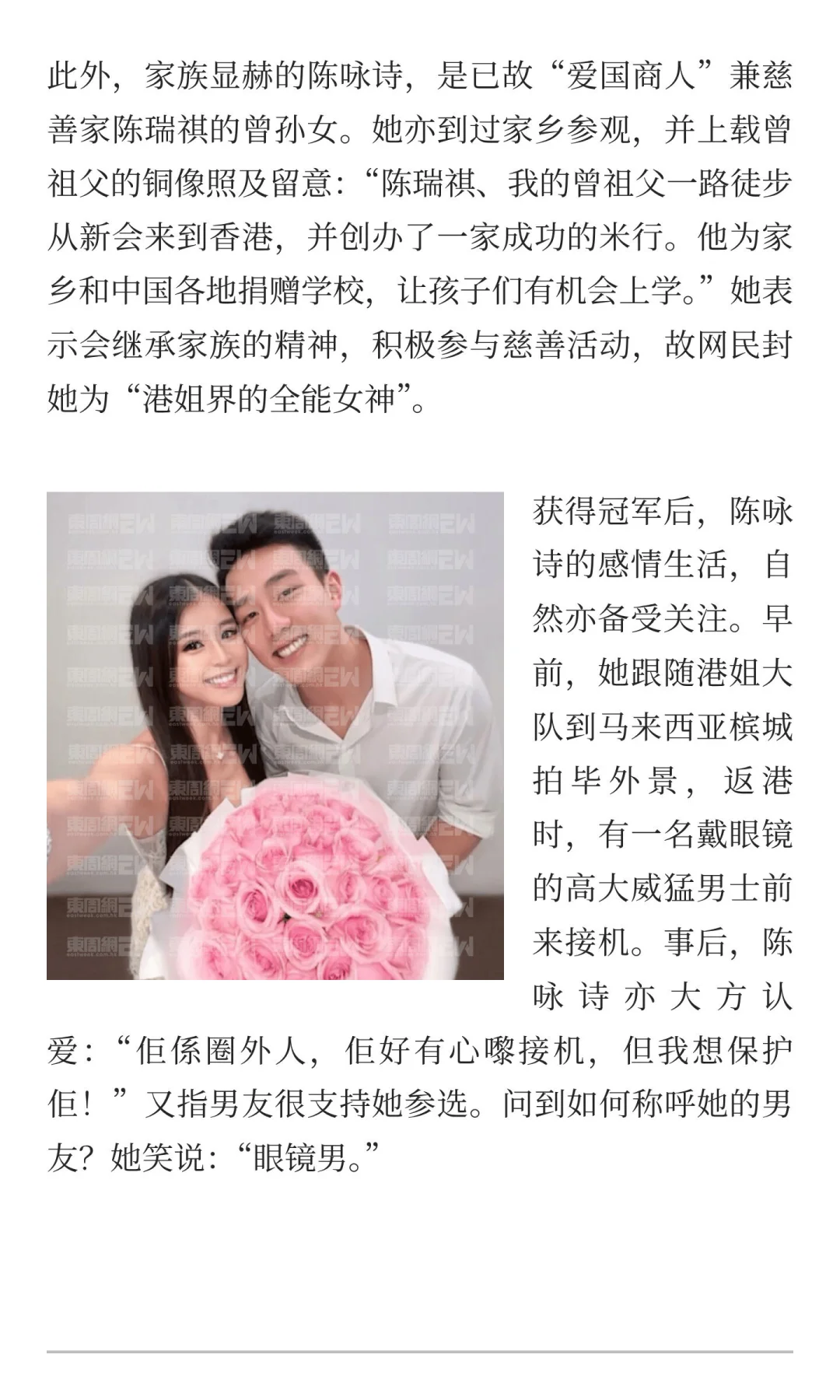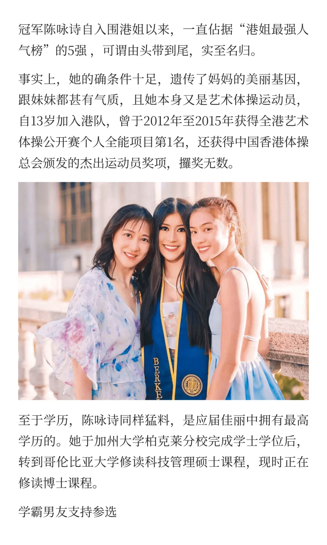 样靓身材好,还多才多艺的陈咏诗,系出名门,其曾祖父是著名“爱国商人”兼慈善家陈瑞祺,背景显赫,就连她就读的全是名牌学府,现于哥伦比亚大学攻读博士课程。她坦言以运动员的心态去对待港姐竞选,难怪越战越勇。