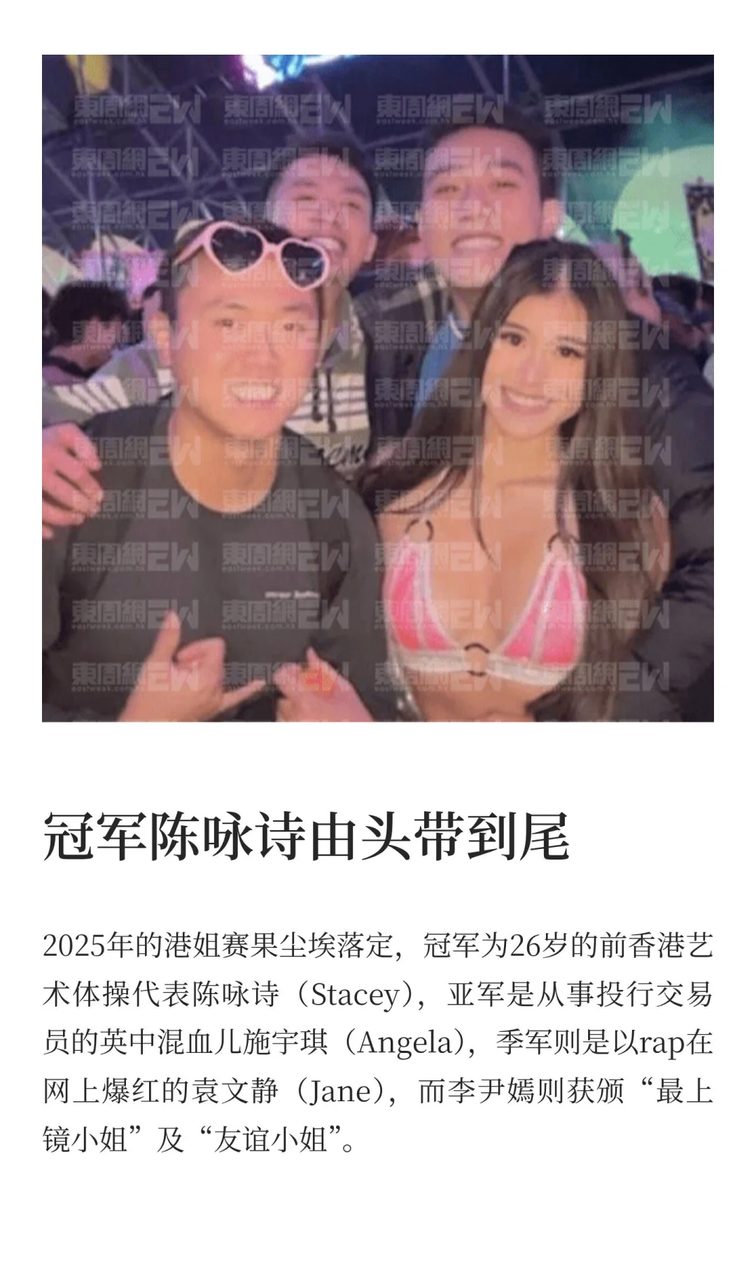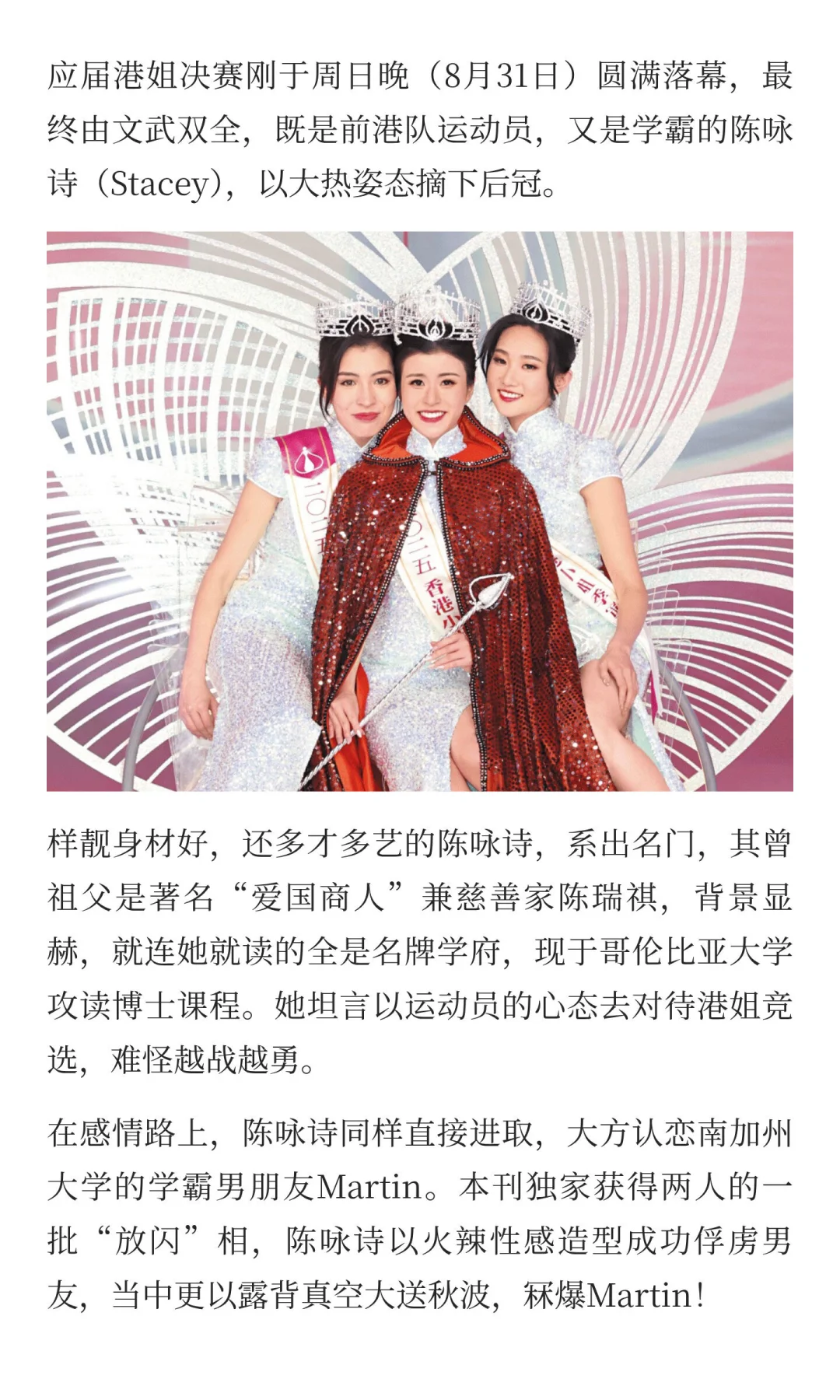 应届港姐决赛刚于周日晚(8月31日)圆满落幕,最终由文武双全,既是前港队运动员,又是学霸的陈咏诗(Stacey),以大热姿态摘下后冠。