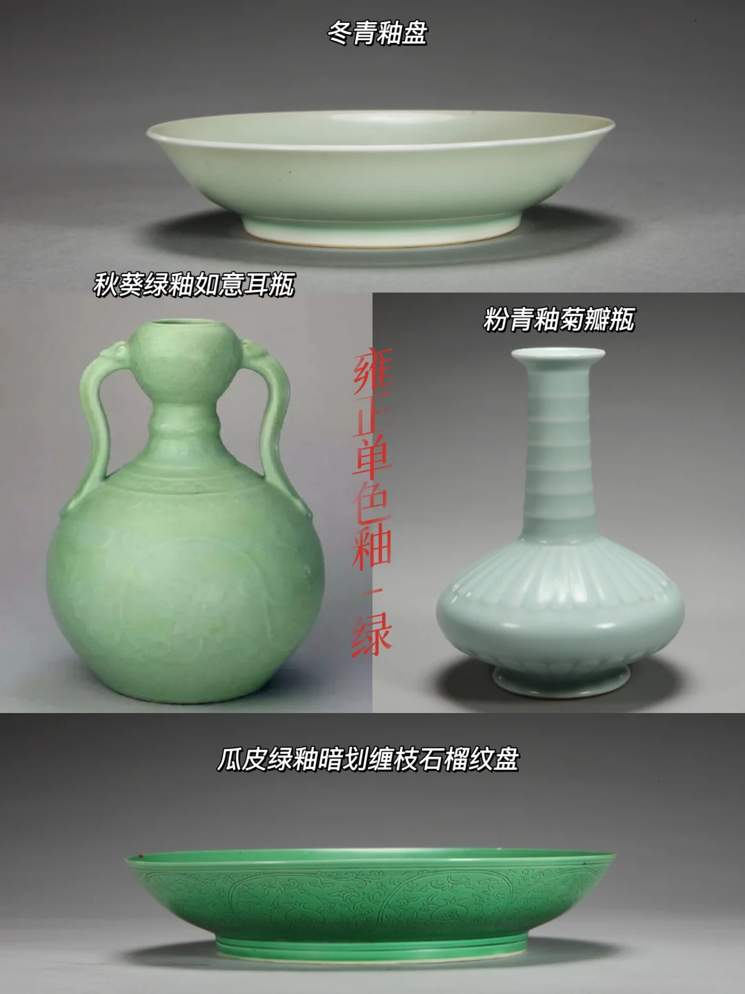 绿有淡雅宜人的秋葵绿、青玉质感的粉青、冬青、清翠匀净的瓜皮绿。