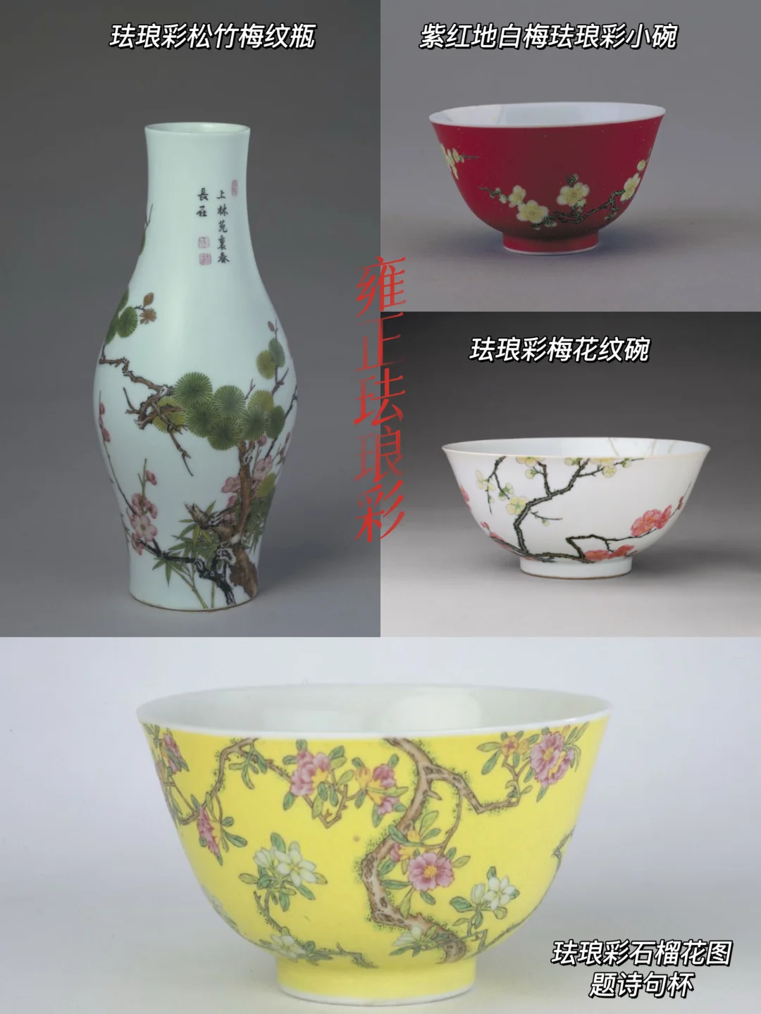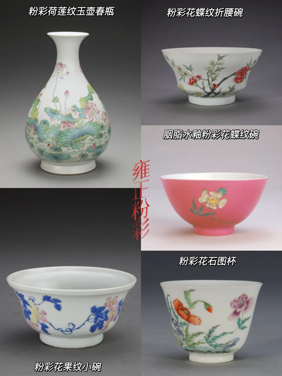 🔹雍正时期的粉彩也同他的审美一样,浓淡相宜、工致秀丽。通常,它们以玻璃白作为底色,用淡粉、浅绿、水蓝、鹅黄加以描绘,令整个画面都轻盈生动。