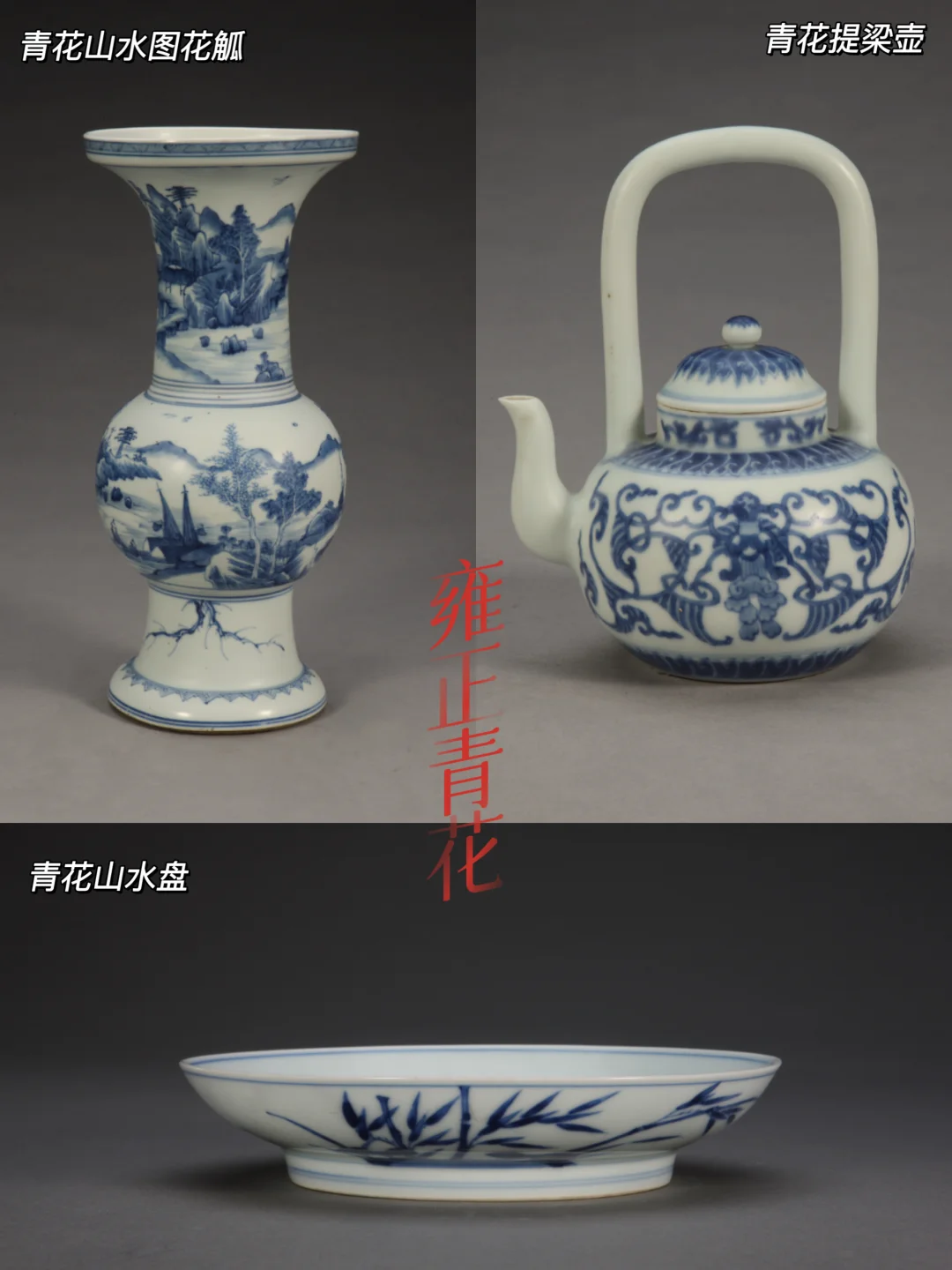 雍正青花多模仿明代永乐、宣德时期的“苏麻离青”效果,青花晕染自然、层次分明,胎质细腻、釉面莹润,相较康熙青花更为舒朗,而比乾隆青花更为含蓄。