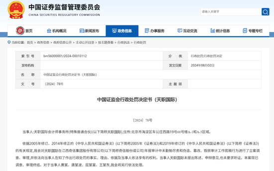 2024年8月16日,证监会披露了一份处罚决定书,天职国际会计师事务所(特殊普通合伙)被证监会罚没超2700万元,同时还被暂停从事证券服务业务6个月。