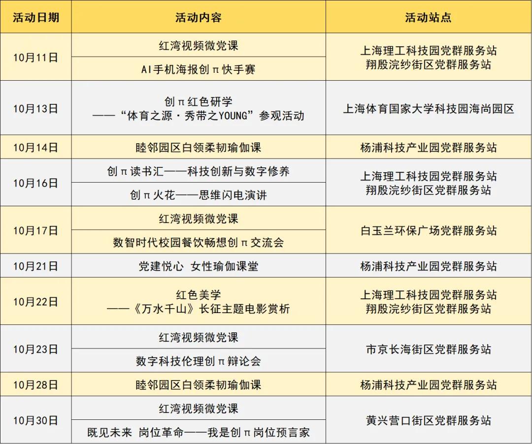为加强党建联建、资源共享、提升服务,在前期意愿征询的基础上,除各站日常党群活动外,现推出2025年10月长海路街道各园区、楼宇和街区党群服务站“两企三新”党群主题活动,预告如下: