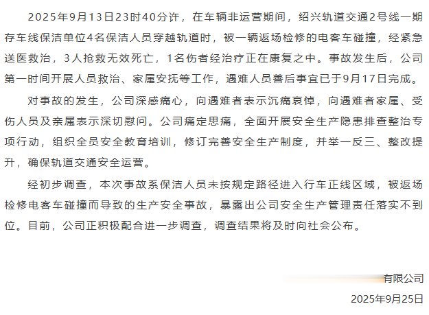 2025年9月13日23时40分许,在车辆非运营期间,绍兴轨道交通2号线一期存车线保洁单位4名保洁人员穿越轨道时,被一辆返场检修的电客车碰撞,经紧急送医救治,3人抢救无效死亡,1名伤者经治疗正在康复之中。事故发生后,公司第一时间开展人员救治、家属安抚等工作,遇难人员善后事宜已于9月17日完成。