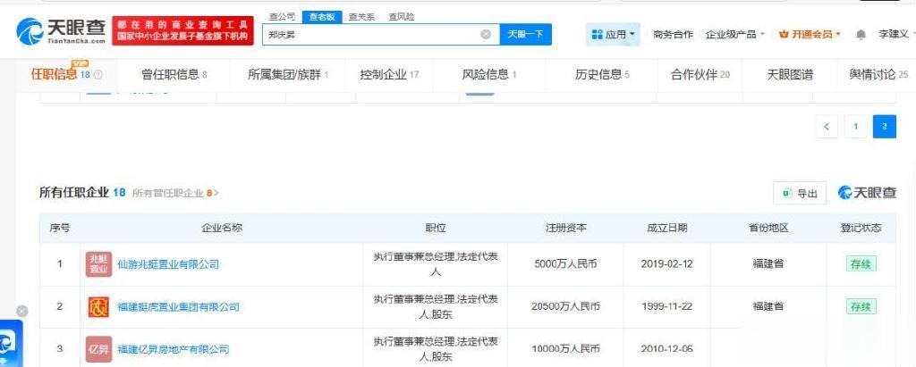 天眼查显示,郑庆昇出生于1956年,中国国籍,无境外永久居留权。在福建亿昇房地产有限公司、福建挺虎置业集团有限公司、上海阿斯顿马丁汽车销售有限公司等17家存续企业中任职。