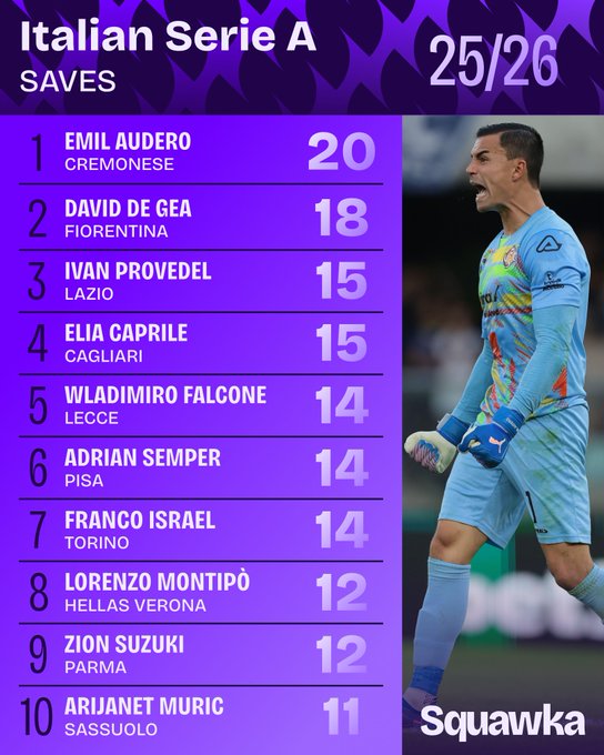 虎扑09月25日讯Squawka数据统计,本赛季意甲扑救榜,奥代罗20次居首,德赫亚18次位居次席。