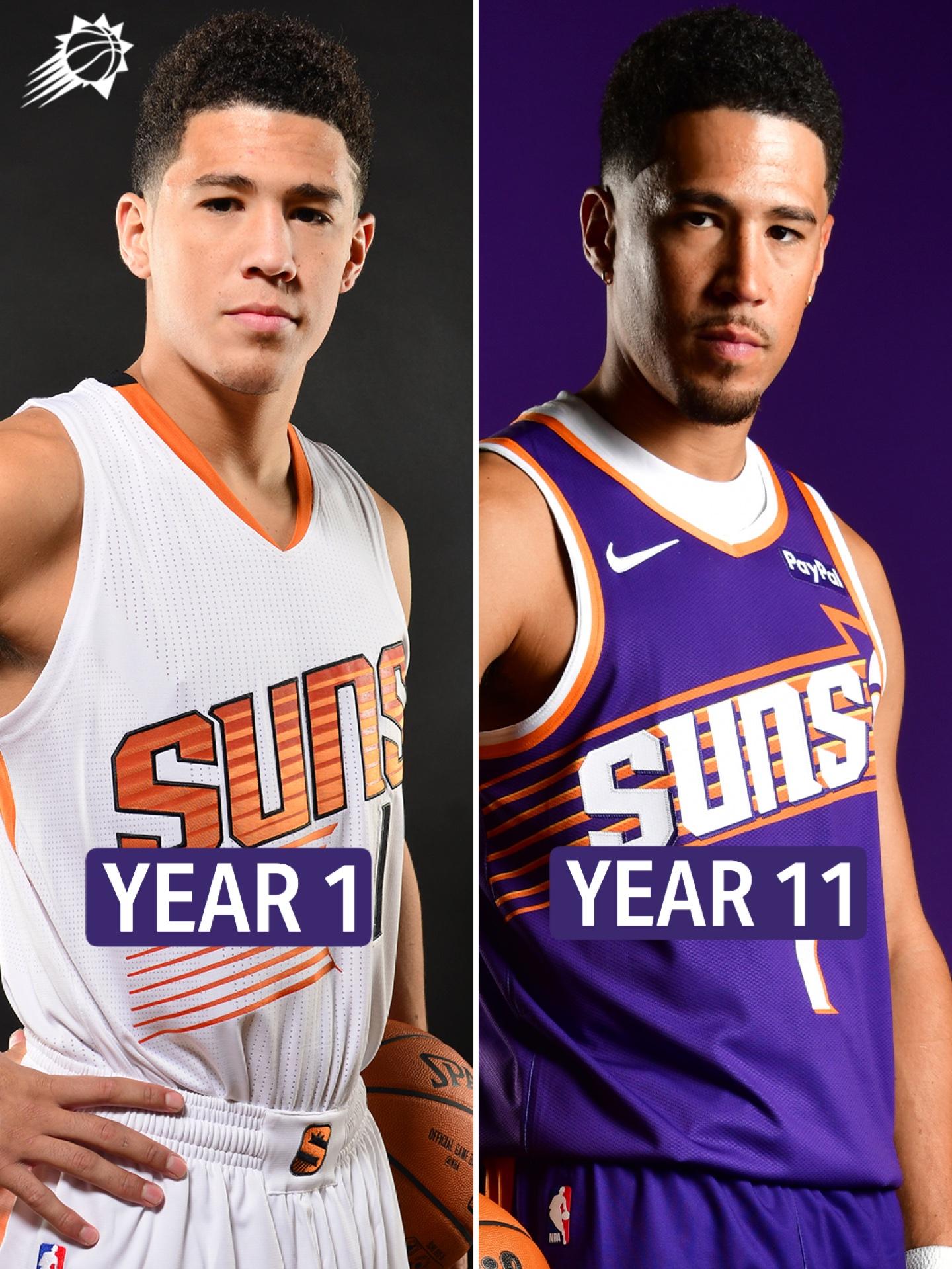 虎扑09月26日讯太阳官方更新X,晒出一张太阳球员德文-布克现在跟新秀时期的定妆对比照与球迷分享。
