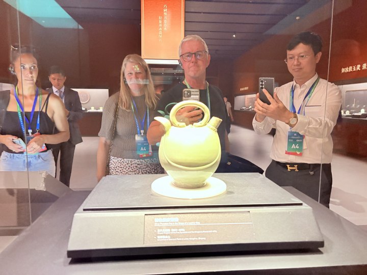 其中一款秘色瓷皮囊壶文物展品吸引了许多外宾驻足欣赏,大家对怎样将游牧民族喝水的皮囊壶烧制成瓷器百思不得其解,更对这精美工艺心生爱慕。