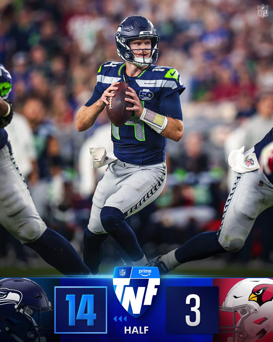 NFL官方X账号发布推文报道,半场战报:西雅图队在客场领先。海鹰vs红雀的比赛正在PrimeVideo直播,同时可通过@NFLPlus流媒体观看。