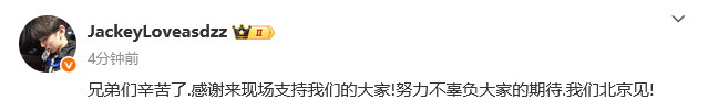 JackeyLove赛后发文:努力不辜负大家的期待,我们北京见!