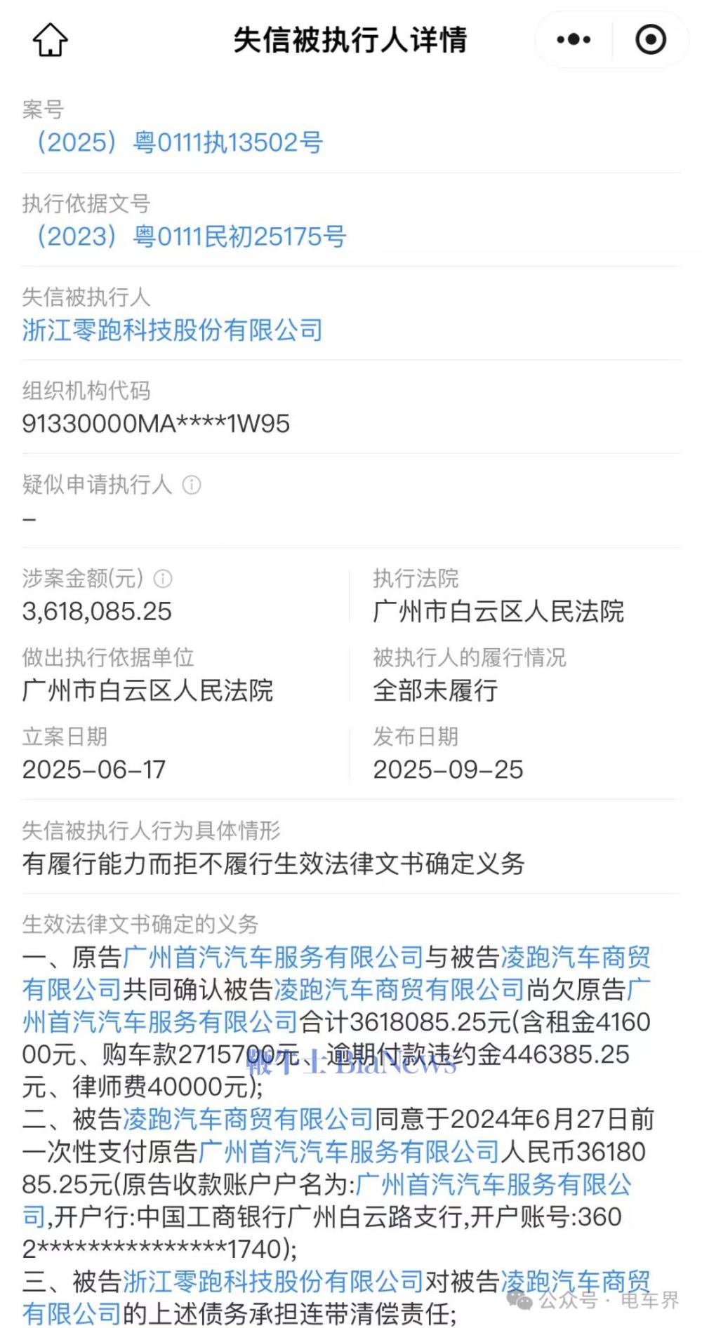 企查查显示,近日,浙江零跑科技股份有限公司因有履行能力而拒不履行生效法律文书确定义务,被广州市白云区人民法院列为失信被执行人(老赖),履行情况为全部未履行,涉及与广州首汽汽车服务有限公司的买卖合同纠纷案件。