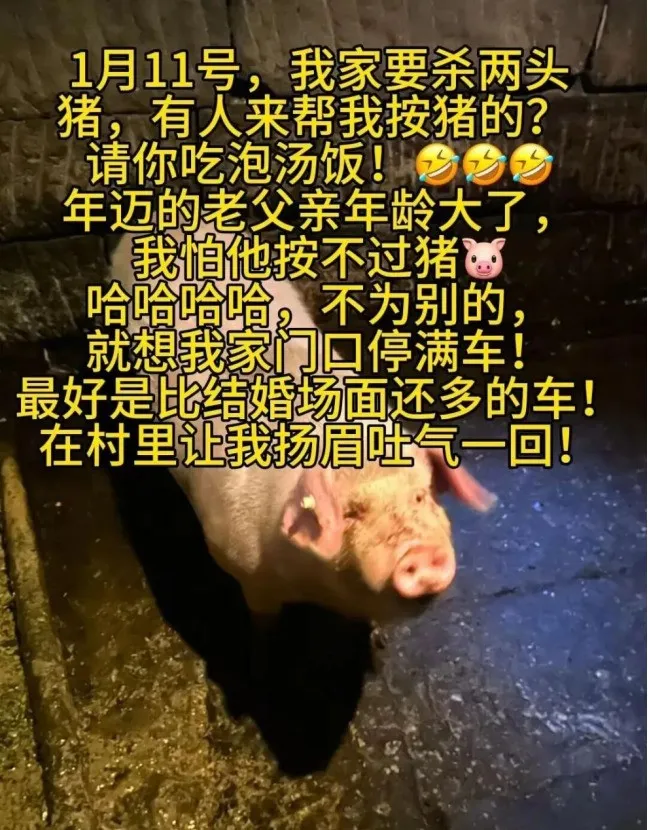 1.缘起杀猪:1月9日,合川女孩“呆呆”因家中杀年猪需要帮手帮忙按猪并想就此在村里乡亲面前“扬眉吐气”一把,在抖音平台发布求助视频,承诺来者“请吃杀猪饭”,热烈欢迎绝不懈怠。