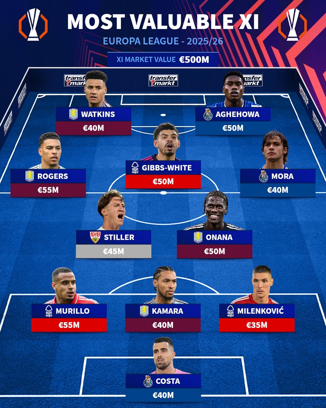 中场:罗杰斯(阿斯顿维拉,5500万欧元)、斯蒂勒(斯图加特,4500万欧元)、吉布斯-怀特(诺丁汉森林,5000万欧元)、奥纳纳(阿斯顿维拉,5000万欧元)、莫拉(波尔图,4000万欧元)