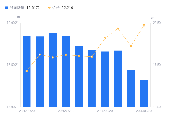 日期A股户数(户)流通A股户均持股数(股)户均持股市值(万元)2025-09-2015605310041.6522.302025-09-101621639663.3019.092025-08-301734839032.7519.732025-08-201730169057.1418.712025-08-101740619002.7616.652025-07-311763778884.5416.512025-07-181823228594.8516.092025-07-101839928516.8315.682025-06-301820358608.4016.132025-06-201824108554.4914.37