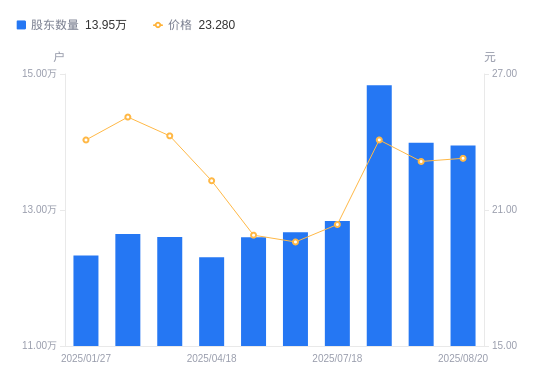 日期A股户数(户)流通A股户均持股数(股)户均持股市值(万元)2025-09-1913586810409.4122.842025-08-2013948510139.4923.602025-08-0813987910110.9323.402025-07-311483409534.2222.972025-07-1812839411015.3622.432025-06-3012673011160.0021.862025-06-1012598711225.8122.332025-04-1812304611494.1325.622025-03-3112604511220.6527.232025-02-2812648711181.4428.07