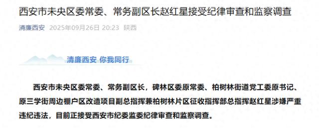 9月26日,据清廉西安:西安市未央区委常委、常务副区长,碑林区委原常委、柏树林街道党工委原书记、原三学街周边棚户区改造项目副总指挥兼柏树林片区征收指挥部总指挥赵红星涉嫌严重违纪违法,目前正接受西安市纪委监委纪律审查和监察调查。