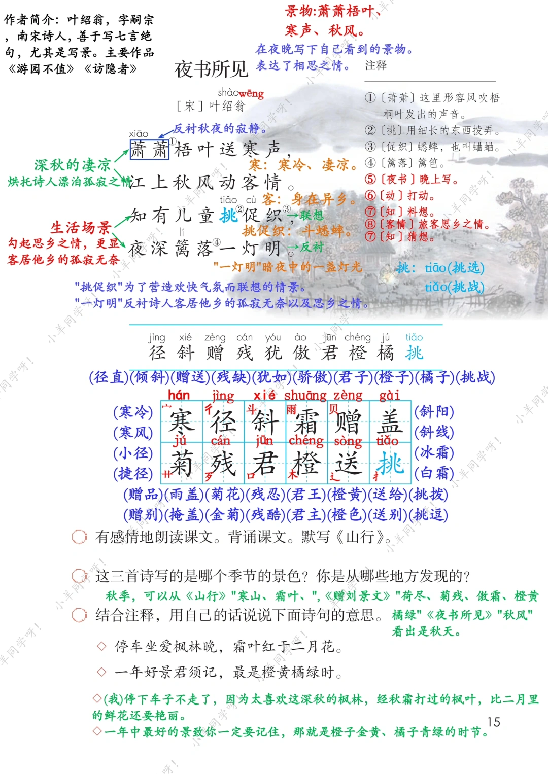 开始持续更新三上笔记啦~[派对R][派对R][派对R] 🌻 《山行》描绘了一幅山林秋色图,表达了诗人对秋天的赞美与喜爱之情。 🌻 《赠刘景文》通过对“荷尽、菊残、橙黄、橘绿”的描写,突出了菊花的残枝有傲霜斗寒的气概,间接表达了作者对友人的殷切嘱咐和勉励。 🌻 《夜书所见》通过对秋风落叶、小孩捉蟋蟀的情景、篱笆下的灯火等的描写,抒发了作者在秋夜思念家乡的情感。