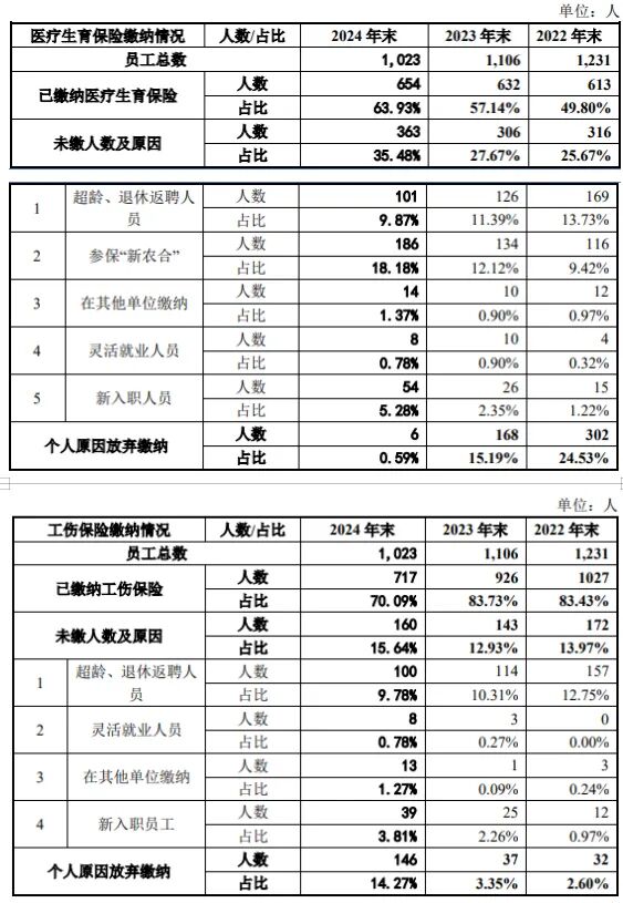 除了以上员工,岷山环能一度存在大量由于个人原因放弃缴纳养老保险的员工。2021—2024年末,由于个人原因放弃缴纳养老保险的人数分别为438人、315人、129人、2人,占比分别为37.12%、25.59%、11.66%、0.20%。