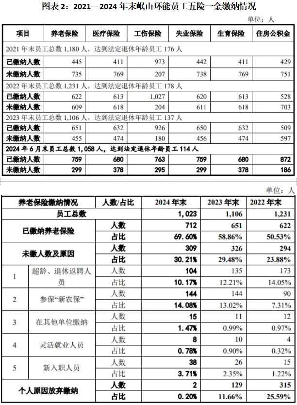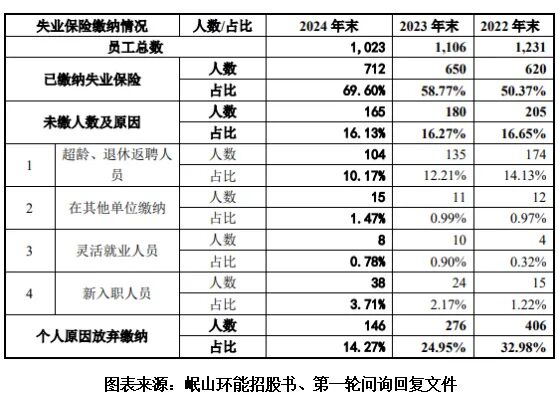 第二轮问询回复文件和招股书显示,2021—2024年末,岷山环能员工数量超过1000名,其中,缴纳养老保险的比例分别为37.71%、50.53%、58.86%、69.60%。