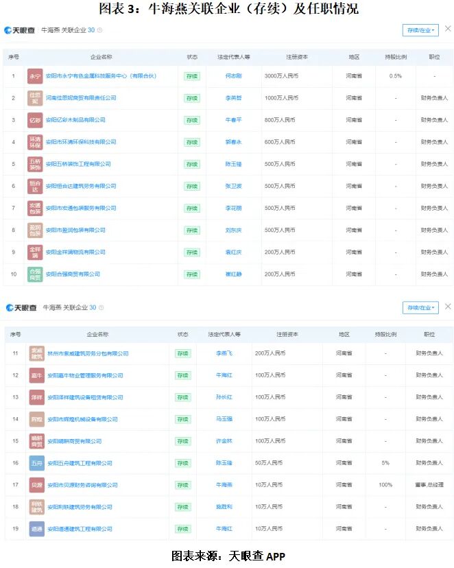 招股书将牛海燕100%持股并担任执行董事兼总经理的安阳市贝源财务咨询有限公司(下称“贝源财务”)列为关联方。天眼查APP显示,牛海燕同名人员共与30家企业存在关联,其中处于存续状态的共有19家,除了贝源财务,牛海燕同名人员还任其他多家企业的财务负责人,且这些企业与贝源财务均位于河南省安阳市。北交所《股票上市规则》中规定,财务负责人属于高级管理人员。