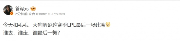 直播吧9月27日讯今日LPL资格赛将迎来四号种子的争夺战,将由iG对阵JDG,胜者将以LPL四号种子的身份晋级世界赛,赛前解说管泽元更博:今天和毛毛,大狗解说这赛季LPL最后一场比赛!谁去,谁走,谁最后一舞?