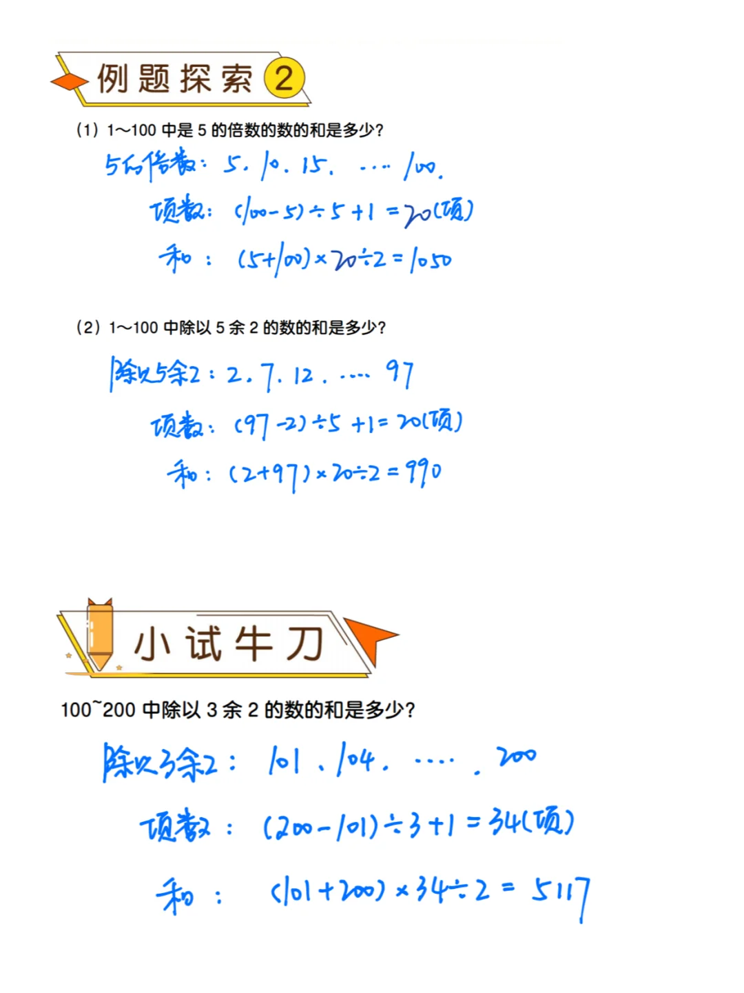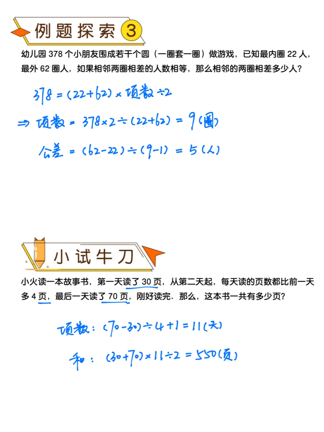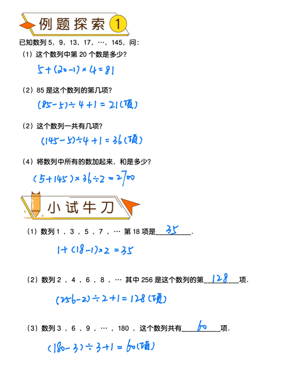 🌈等差数列基本知识点 👉等差数列中重要的四个量: (1)首项:第一个数 (2)末项:最后一个数,有时也代表你想求的第几项; (3)项数:一共的个数 (4)公差:相邻两个数的差 👉等差数列中重要的公式: 1️⃣、未项=首项+ (项数-1) x公差 2️⃣、项数=(末项-首项)÷公差+1 3️⃣、公差=(末项-首项) ÷(项数-1) 4️⃣、和=(首项+末项)x项数÷2 5️⃣、和=中间项×项数(适用条件:在等差数列中,项数为单数)