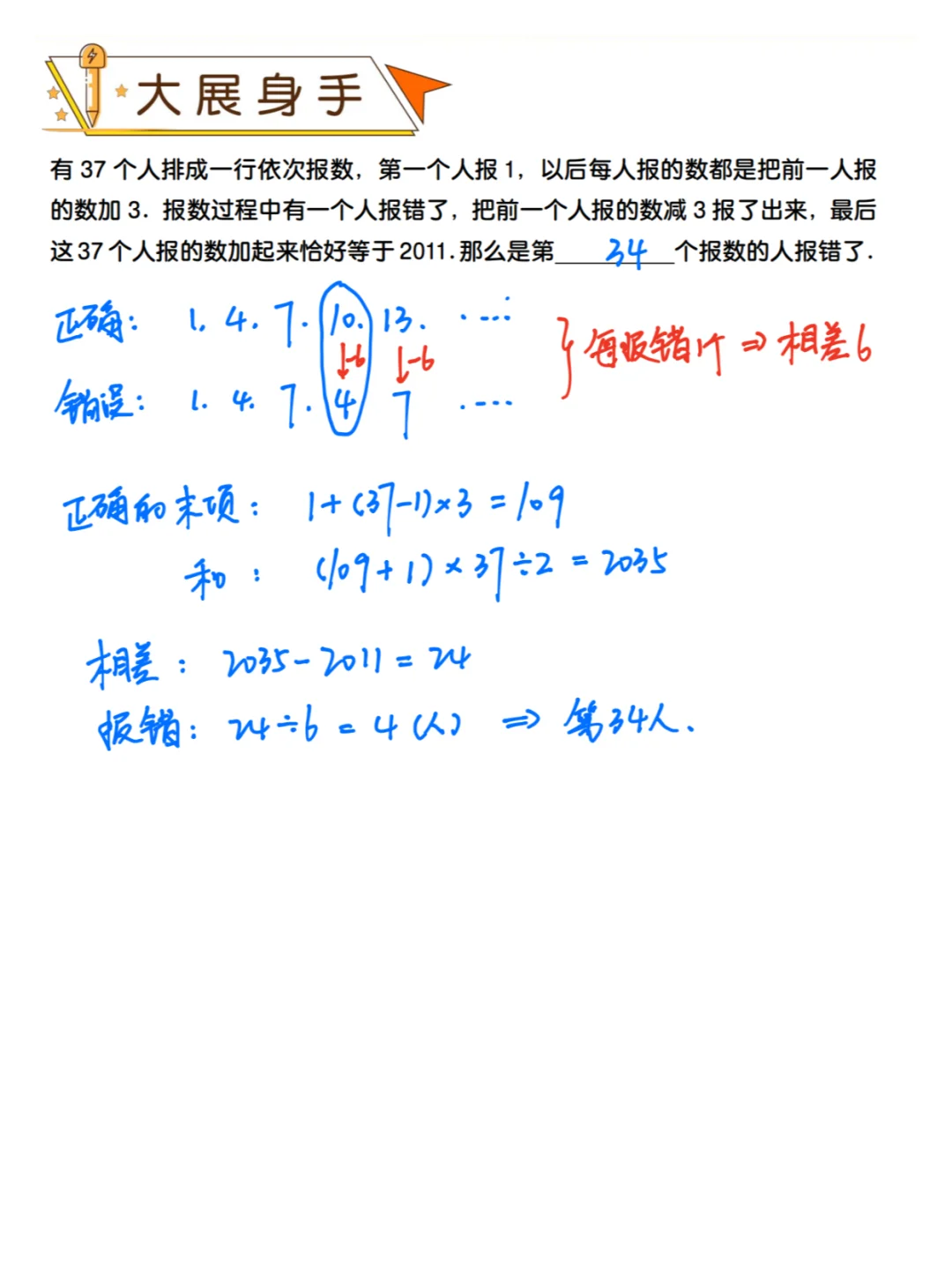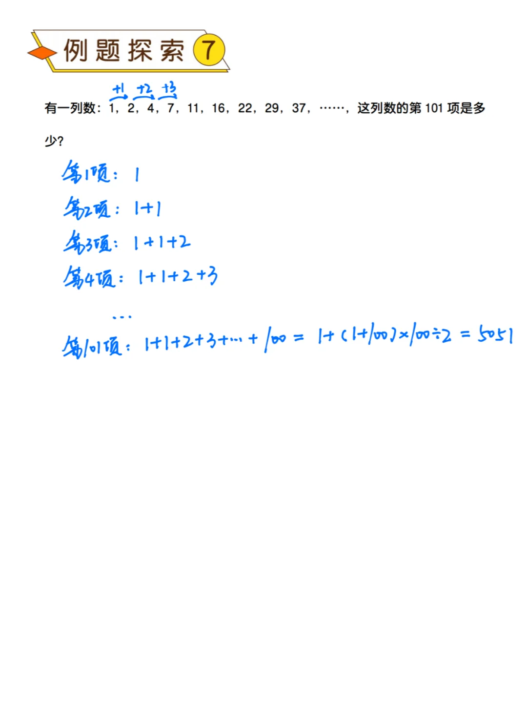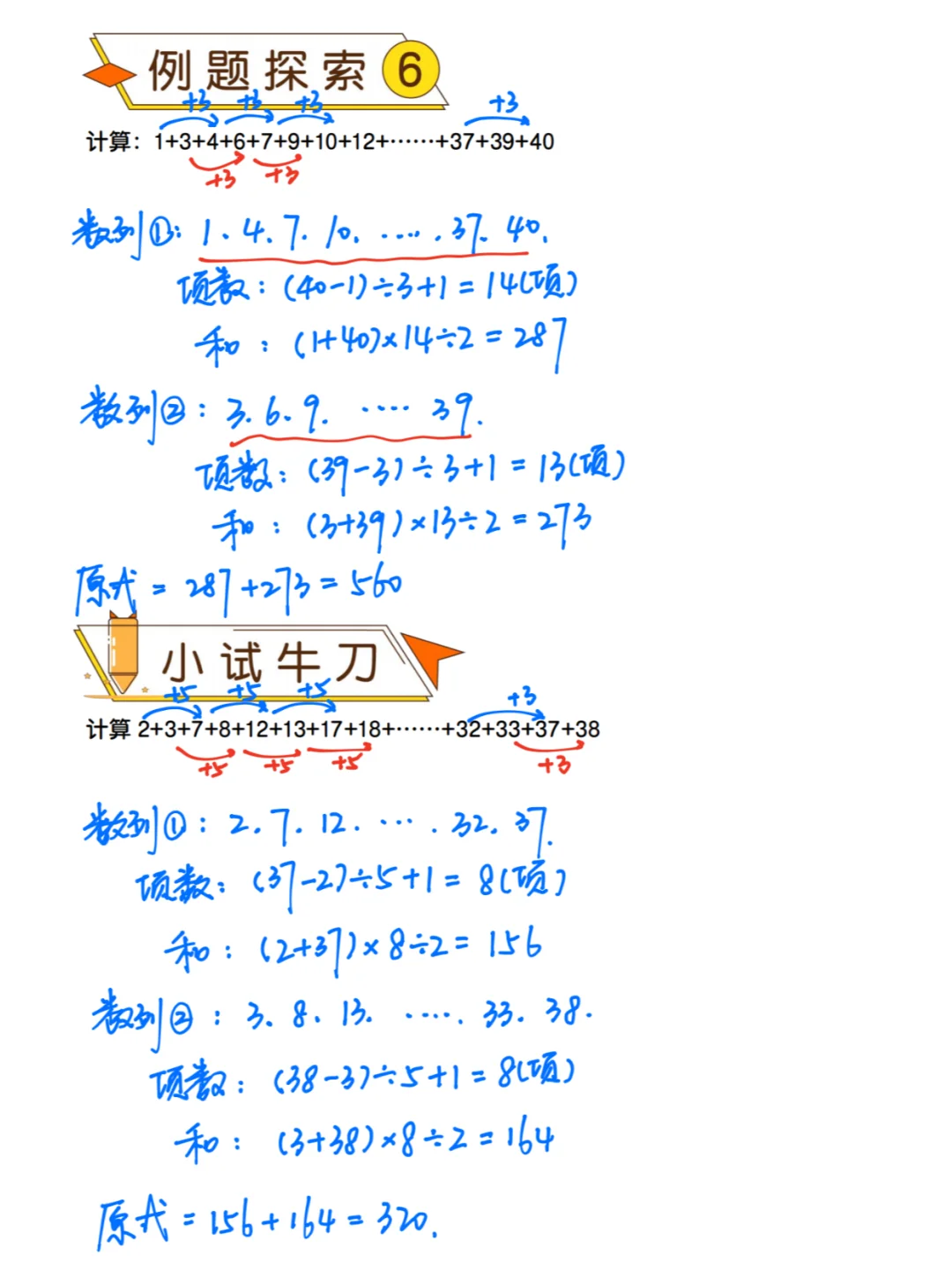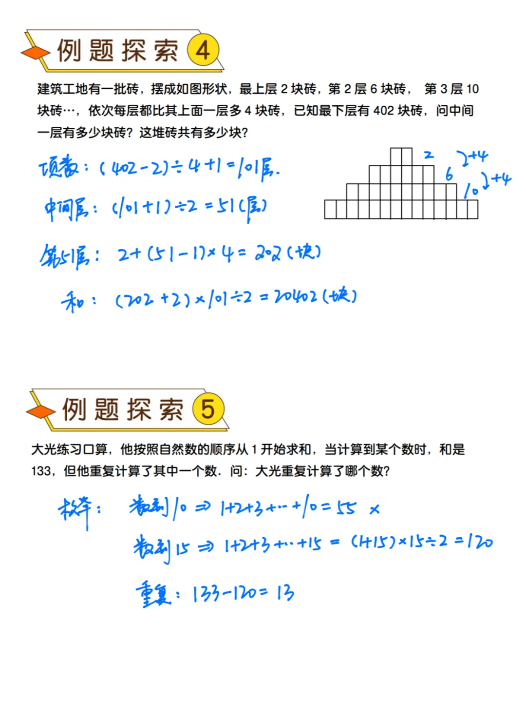 🌈等差数列基本知识点 👉等差数列中重要的四个量: (1)首项:第一个数 (2)末项:最后一个数,有时也代表你想求的第几项; (3)项数:一共的个数 (4)公差:相邻两个数的差 👉等差数列中重要的公式: 1️⃣、未项=首项+ (项数-1) x公差 2️⃣、项数=(末项-首项)÷公差+1 3️⃣、公差=(末项-首项) ÷(项数-1) 4️⃣、和=(首项+末项)x项数÷2 5️⃣、和=中间项×项数(适用条件:在等差数列中,项数为单数)