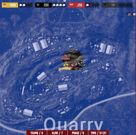 梅花桩刷新,JDG先被两队夹击淘汰,随后WBG最后两人也被EDG淘汰,EDG成功吃鸡。