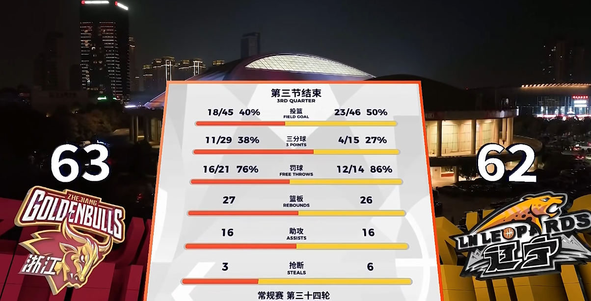 第二节辽宁内线非常吃亏,半场没打完就有2名主力身背3犯,后半节吴前、陆文博再中3记三分,浙江再度扩大领先,半场战罢,浙江46-43辽宁,浙江三分球半场25中10,辽宁仅有10中2。