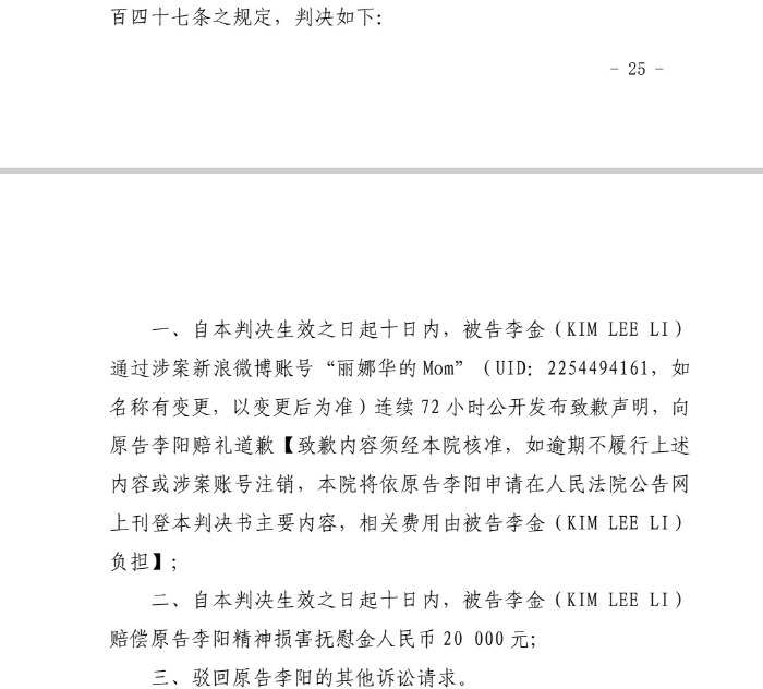 最终,法院判决,被告李金通过涉案微博账号“丽娜华的Mom”连续72小时公开发布致歉声明,向原告李阳赔礼道歉,并赔偿李阳精神损害抚慰金人民币20000元。