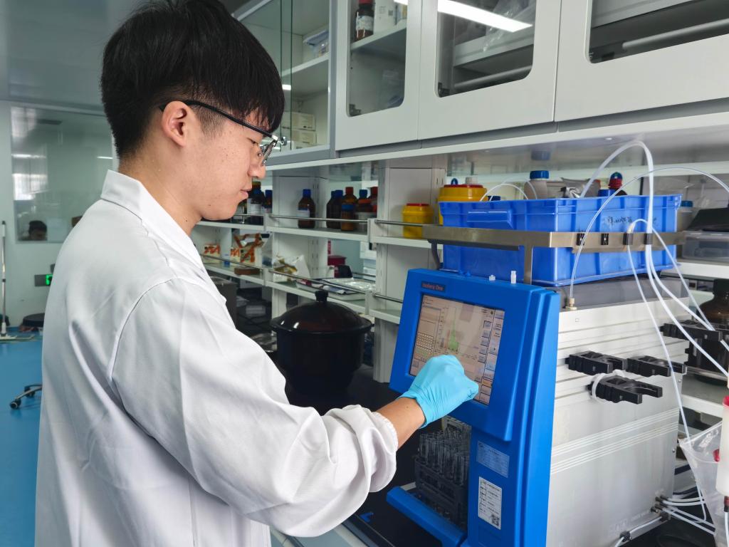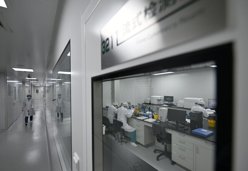 合源生物科技(天津)有限公司工作人员在生产基地的检测室进行检测。新华社记者赵子硕摄