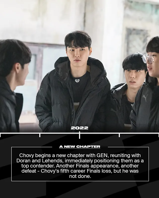 Chovy加入GEN,与Doran和Lehends重聚,瞬间让他们成为顶级强队。春季打进决赛,却又吞下失败的苦果——这是Chovy职业生涯的第五次总决赛失利。但他还未停下脚步。