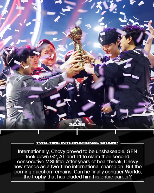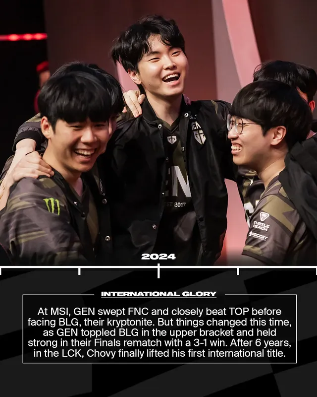 MSI上,GEN横扫FNC,险胜TOP,并迎来宿敌BLG。不同于以往,这次他们成功击败对手,并在决赛重赛中以3-1拿下冠军。六年后,Chovy终于捧起了自己首个国际冠军奖杯。