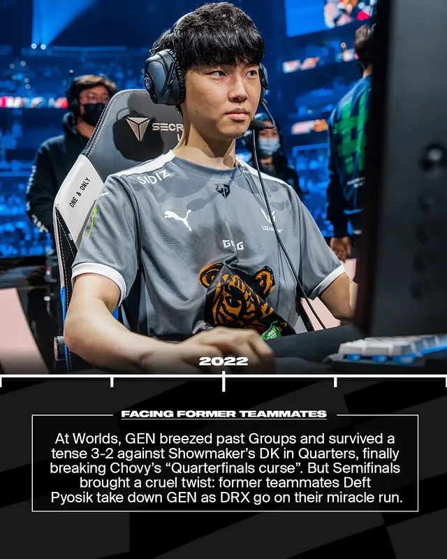 世界赛上,GEN小组轻松出线,并在八强鏖战五局击败ShowMaker的DK,打破Chovy的“八强魔咒”。但四强迎来残酷一幕:前队友Deft与Pyosik带领DRX完成奇迹之旅,淘汰GEN。