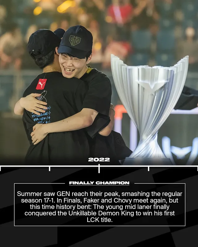 夏季GEN达到巅峰,常规赛17胜1负。决赛再次相遇Faker,但这次命运改写:年轻的中单终于击败“不灭魔王”,赢下自己首个LCK冠军。