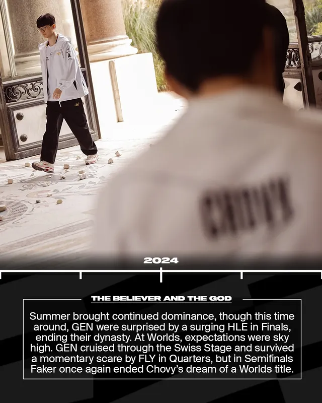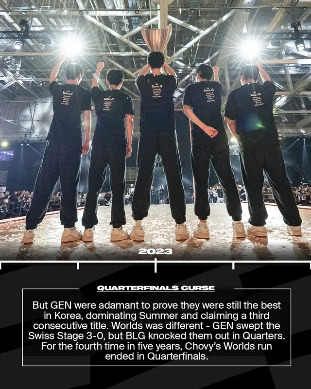 夏季赛GEN卫冕成功,连续第三次称霸LCK。世界赛小组赛他们3-0横扫晋级,但在八强再次被BLG淘汰。过去五年里,Chovy四次止步八强。