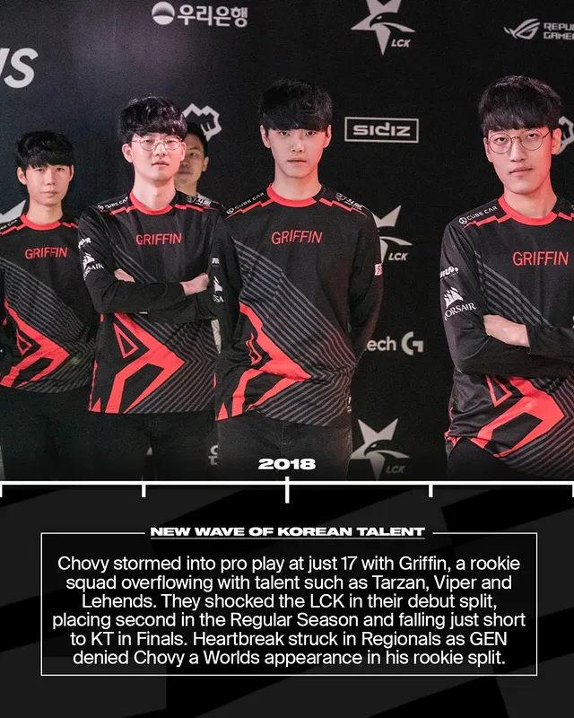 年仅17岁的Chovy随着Griffin闯入职业赛场,这支新军天赋爆棚,拥有Tarzan、Viper和Lehends等选手。他们在首次LCK赛季就震惊全场,常规赛排名第二,仅在决赛惜败KT。遗憾的是在地区资格赛中被GEN阻挡,Chovy新秀年无缘世界赛。