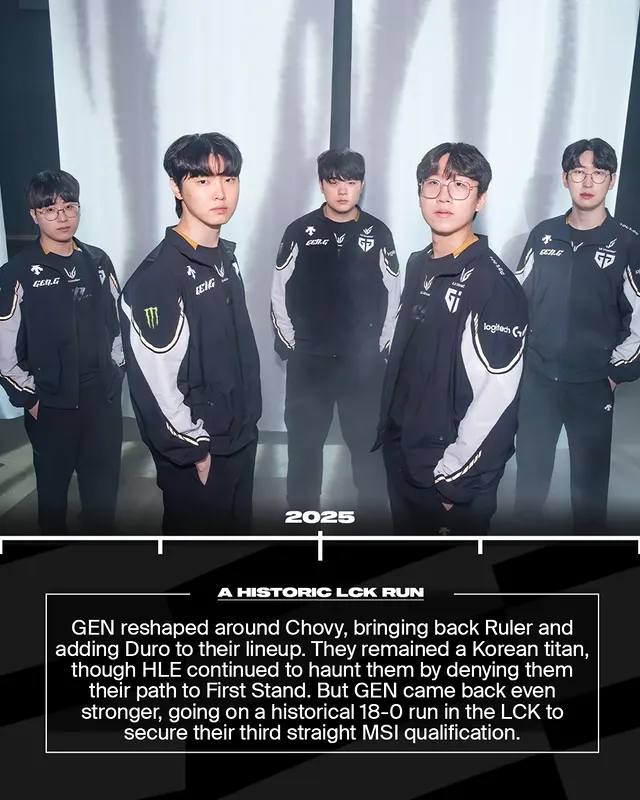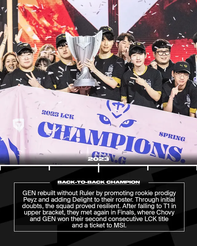 GEN队伍重组,Ruler离队,启用新秀射手Peyz,并引入辅助Delight。起初质疑不断,但他们一路顽强闯进决赛。败者组输给T1后,在总决赛复仇成功,Chovy夺下第二个LCK冠军,并获得MSI门票。