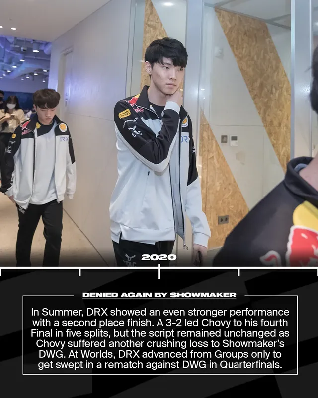 夏季赛DRX状态更盛,常规赛第二打进决赛,这是Chovy五个赛季里的第四次总决赛。但剧本未变,他们在与ShowMaker的DWG较量中又一次失利。世界赛上,DRX小组出线,却在八强被DWG横扫。