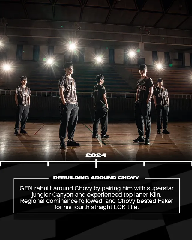 GEN围绕Chovy重建,引入超级打野Canyon与经验丰富的上单Kiin。结果显而易见——他们延续地区统治,Chovy更是再次击败Faker,拿下第四连冠。