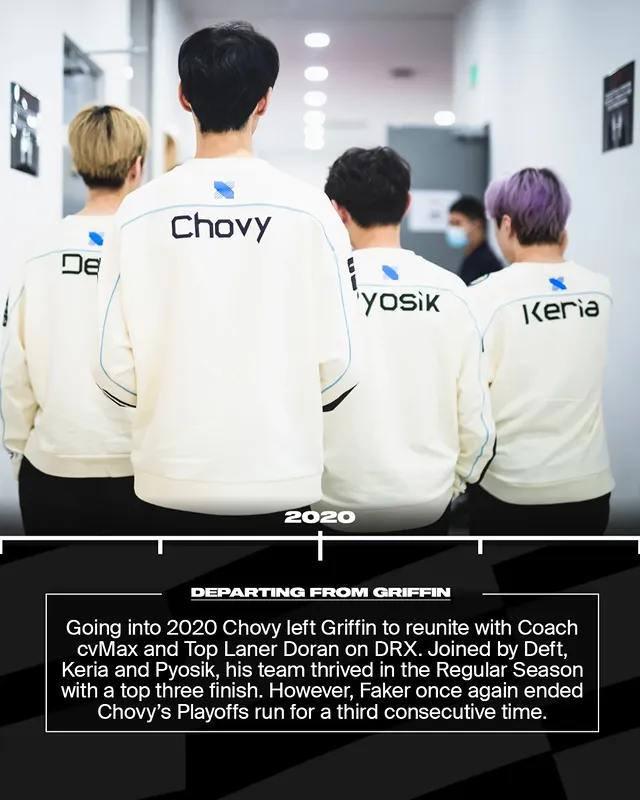 进入2020年,Chovy离开Griffin,加入DRX,与教练cvMax以及老搭档Doran重聚。队伍还拥有Deft、Keria与Pyosik,常规赛表现强劲,位居前三。但在季后赛,Faker再一次终结了Chovy的征途,连续第三次将他挡在冠军之外。