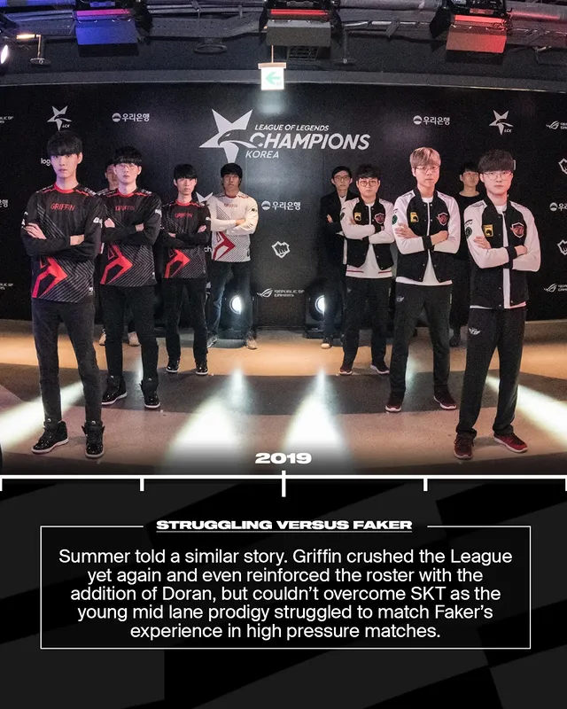 夏季赛依旧如出一辙。Griffin再次统治联赛,还引入Doran增援,但依旧没能战胜SKT。年轻的中单天才在关键对局中难以与Faker的经验抗衡。