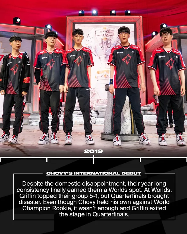 尽管国内的失望不断,他们全年稳定的表现终于换来世界赛资格。小组赛中,Griffin以5-1出线,但八强成为噩梦。即便Chovy在对位世界冠军Rookie时发挥不俗,Griffin还是止步八强。