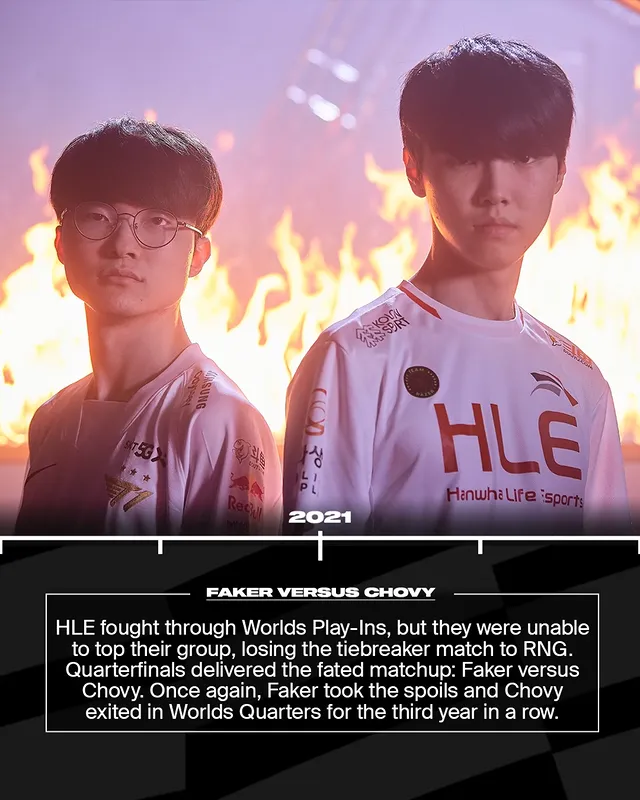 HLE打完入围赛,却未能以小组头名出线,在加赛中输给RNG。八强迎来宿命对决:FakervsChovy。但结局依旧,Faker再次取胜,Chovy连续第三年止步世界赛八强。