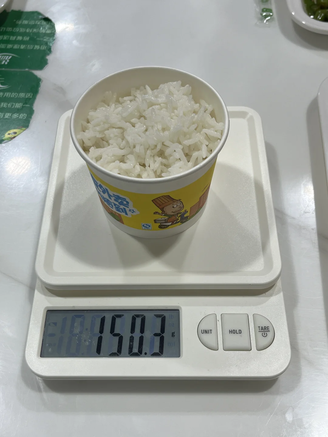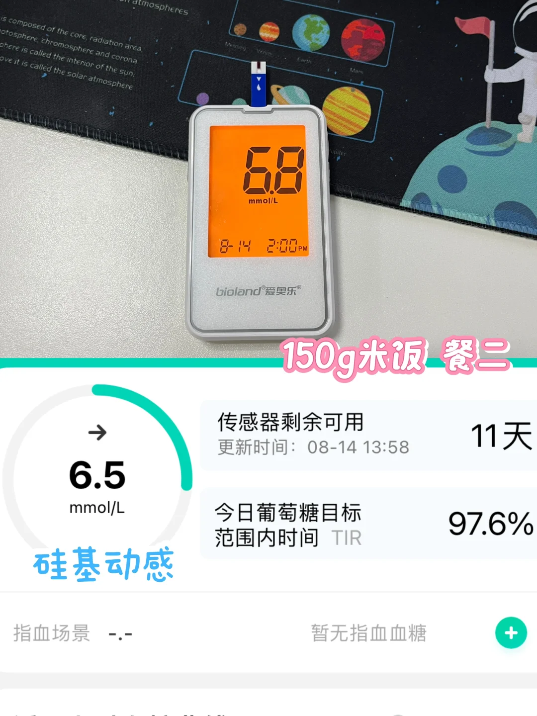 今天吃了150g米饭,一称才那么一点,那种一次打汤的碗🥣都没满,刚好平铺到分餐盘子那一格!就是你们所说的一拳!吃完🍚测了下餐2⃣️,爱奥乐6.8 ,硅基6.5,挺准的~